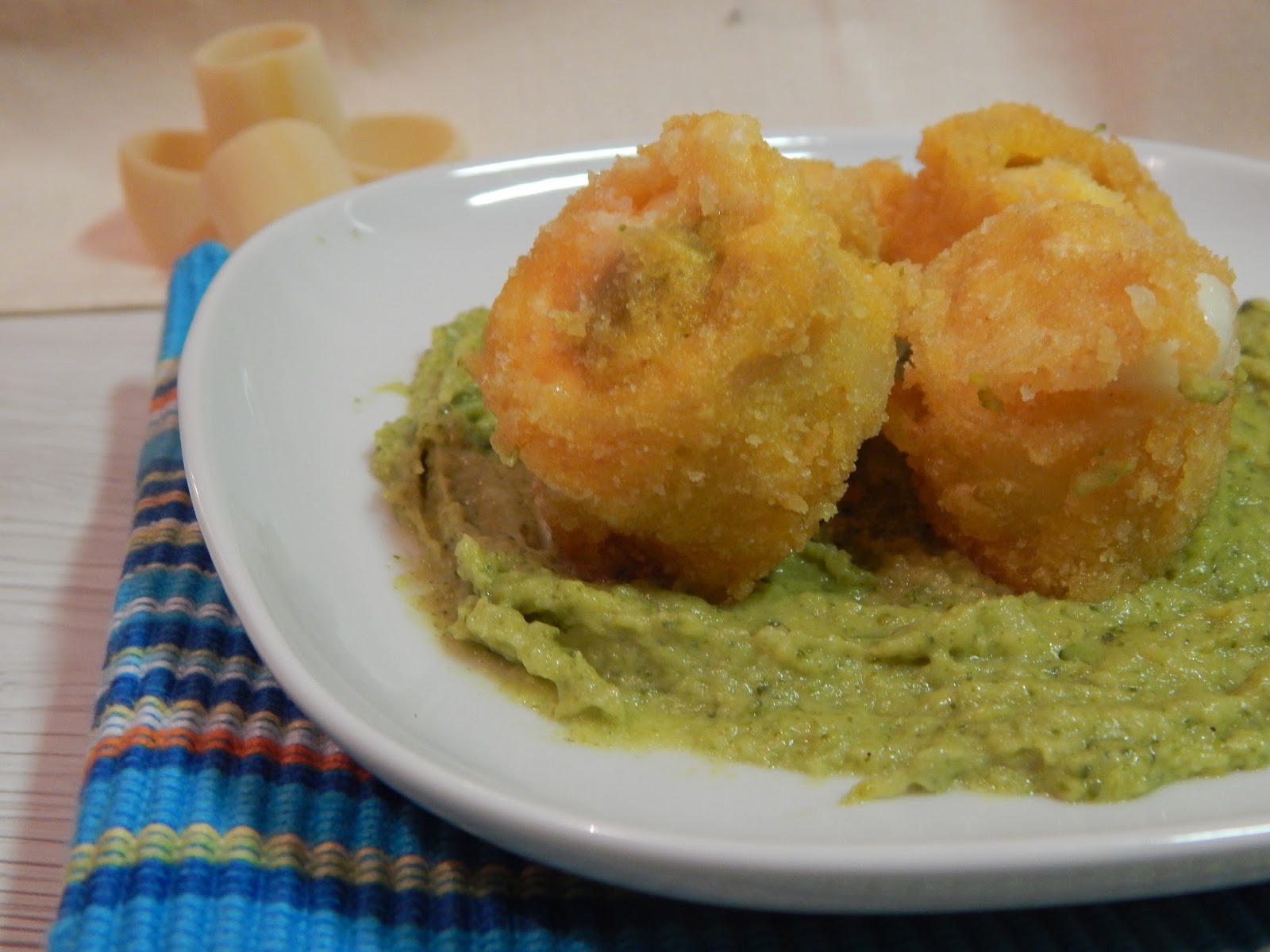 Anelli in carrozza con mozzarella e olive su una crema di cavolo broccolo all’aglio