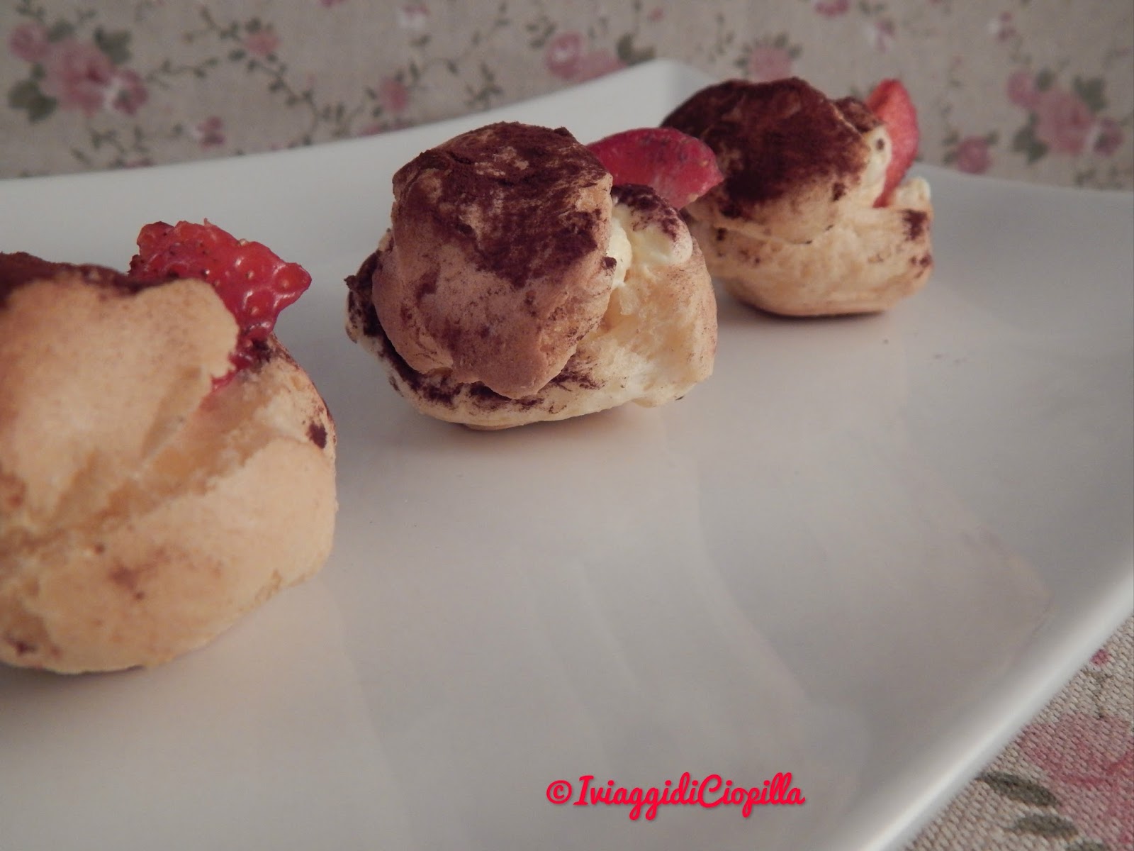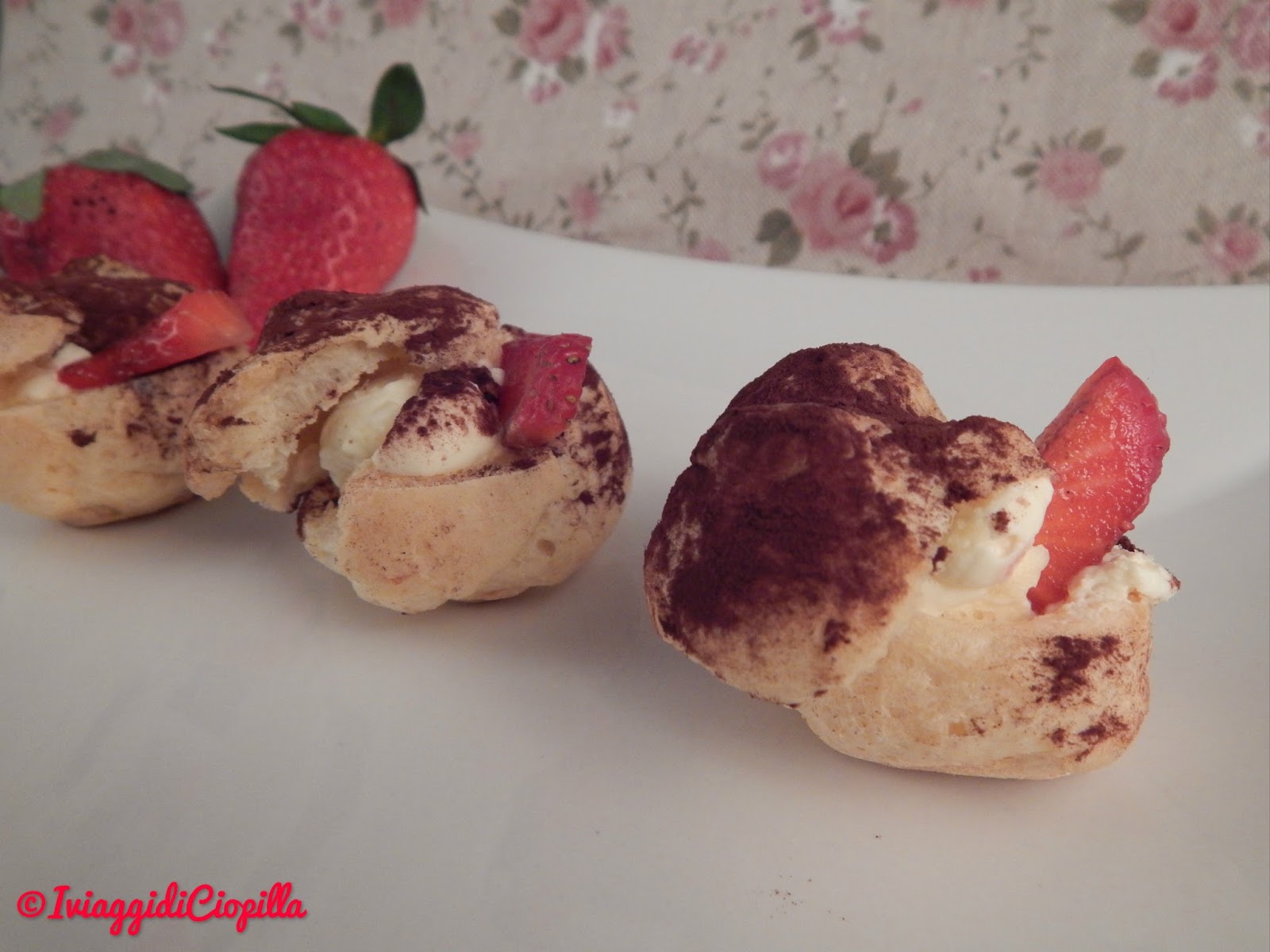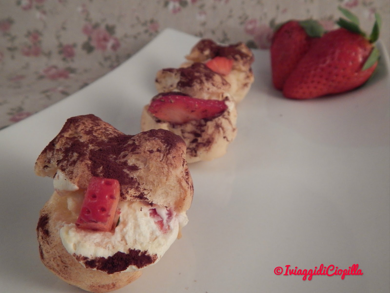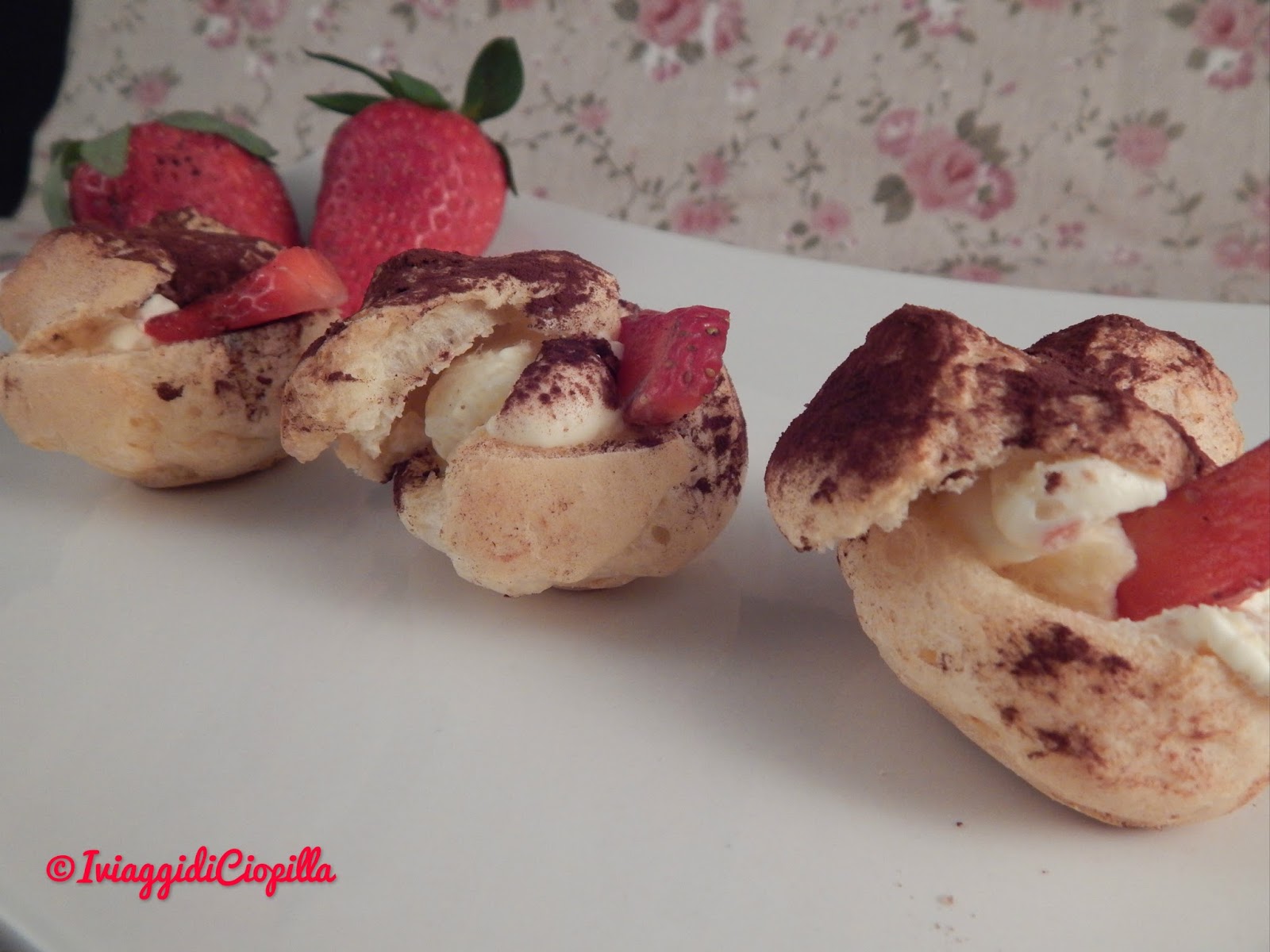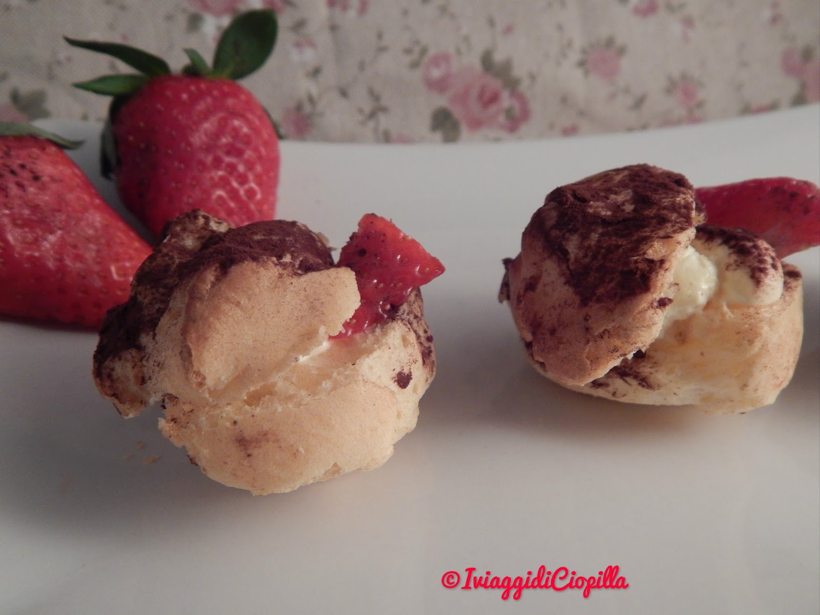 Bignè alla crema di mascarpone e fragole con spolverata di cacao amaro