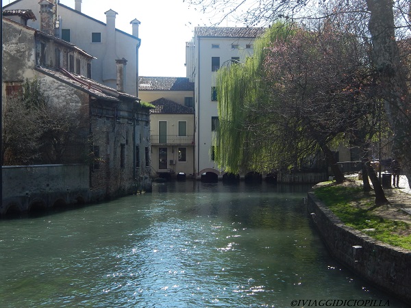 Iniziamo il nostro itinerario a Treviso osservando le sue piccole viuzze e passando davanti al primo complesso monumentale della città – San Francesco – ci fermiamo per osservarne la maestosità e l’opera in sé ma decidiamo di proseguire oltre, in quanto una funzione religiosa in corso impediva di fotografarne ogni suo angolo. Giriamo alla prima strada a destra, che scopriamo essere chiamata Via San Franceso e attraversiamo il primo dei ponti che si affacciano sul canale Cagnan. Le sue acque basse ma forti e impetuosecreano il giusto movimento per le pale dei mulini che ancora attivi su tutto il territorio fanno da sfondo al primo panorama di questa città veneta. Il rumore sordo dell’acqua che picchia sulle pale in movimento e la particolarità delle case che si rispecchiano nell’acqua, ci lascia senza fiato.