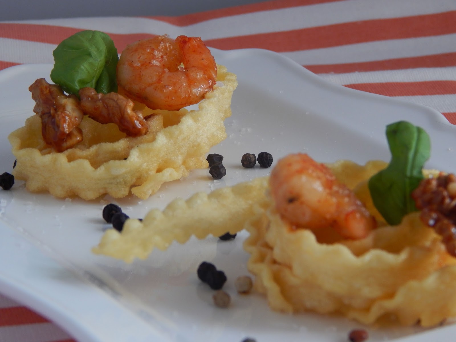 - Ingredienti: 10 pezzi di pasta tipologia La Mafalda Pasta Armando, 8/10 code di gambero già sgusciati e puliti, 4/5 gherigli di noci, olio di semi di girasole vari per friggere e sale q.b.