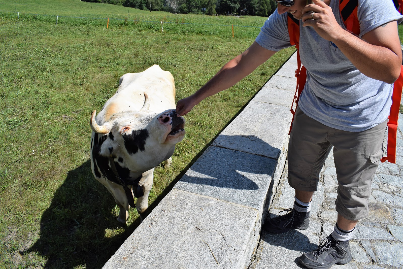 Prima di lasciare la meravigliosa famiglia che gestisce il rifugio, una coccola alla mascotte appena nata, ci serve per ricaricare le batterie per intraprendere il sentiero che ci avrebbe portato in località Servaz desot e al suo relativo lago.