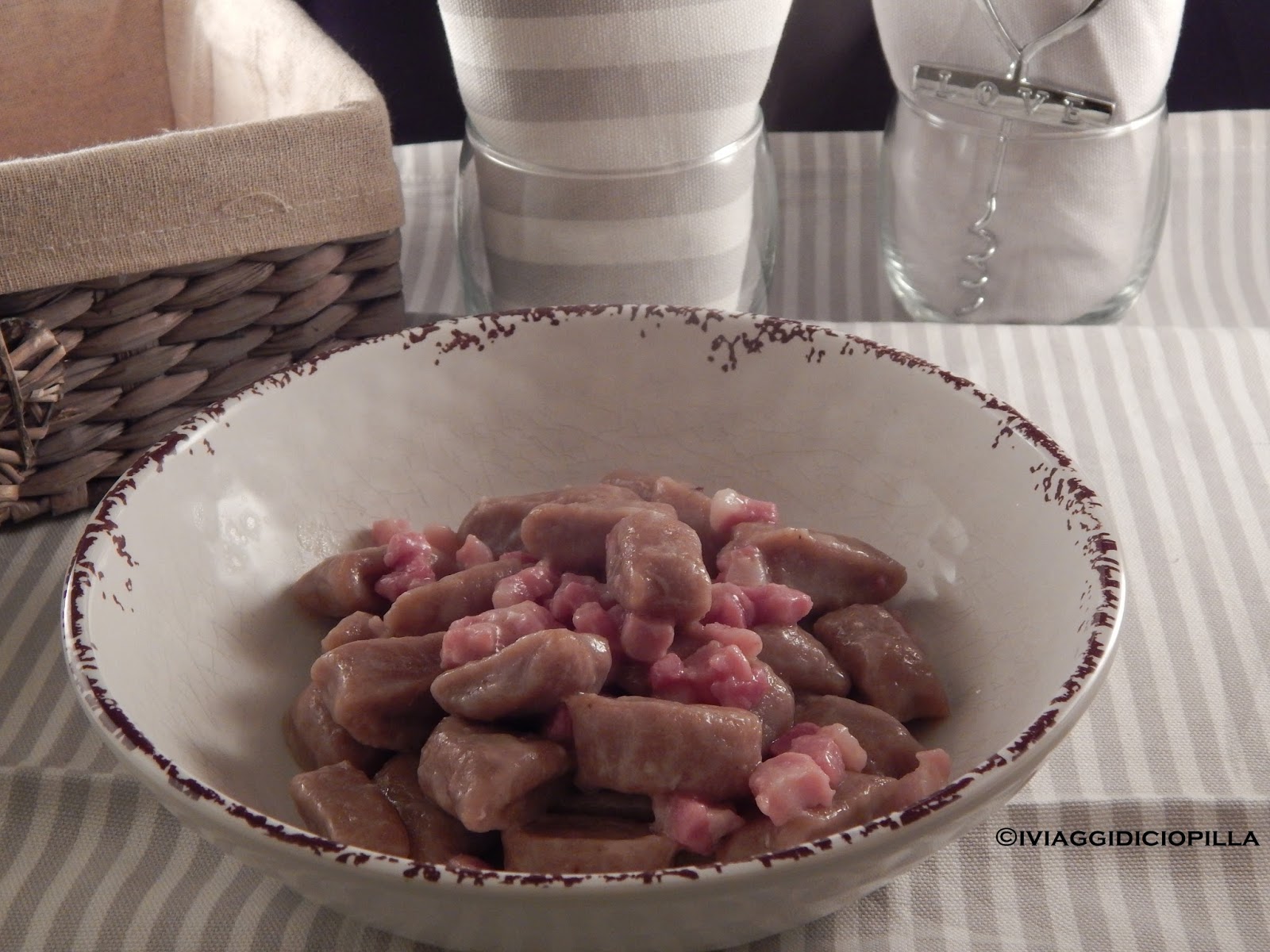 Ingredienti  gnocchi:  250 g farina 00, 150 g farina di Castagne qualità marroni, 100 g di latte temperatura ambiente, 1 pizzico di sale, acqua q.b.