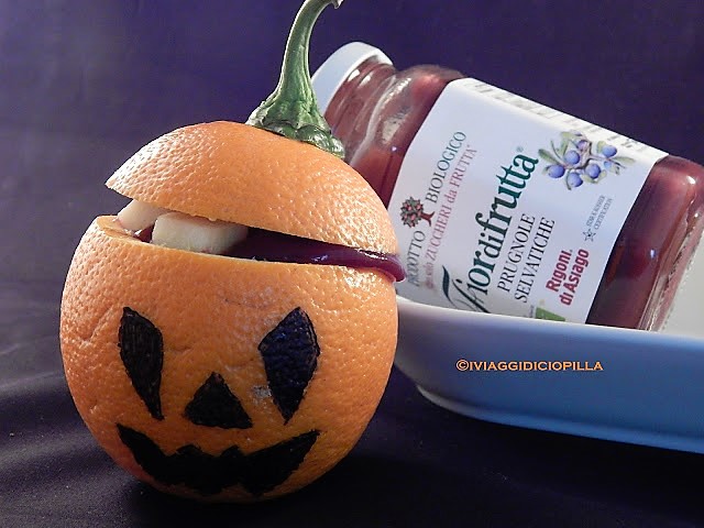 Halloween : Zucca d’arancia ripiena di macedonia alla frutta e Prugnole Selvatiche