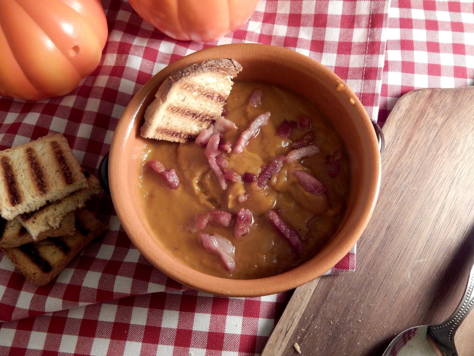 Tempo di zucche. Tempo di soap, zuppe calde. Tempo caldo ma con l’occhio rivolto verso il freddo inverno. Una ricetta gustosa e piena di sapori in contrasto fra loro: il dolce della zucca con l’amarognolo del porro, il croccante del bacon con la morbidezza del pane in una zuppa assolutamente invernale da gustare davanti al camino acceso insieme ai propri cari.